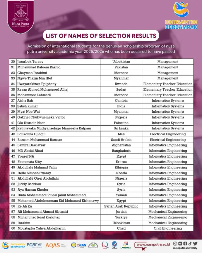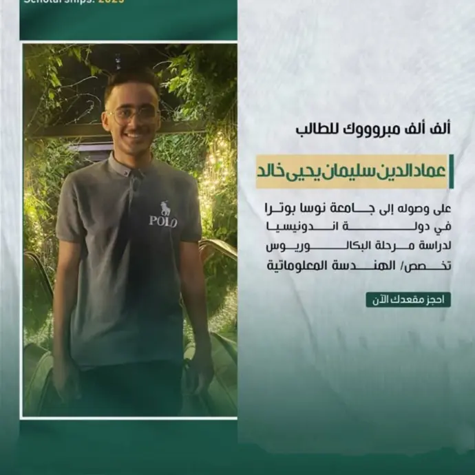 ألف ألف مبروك للطالب عماد الدين لحصوله على منحة دراسية في جامعة نوسا بوترا بإندونيسيا لدراسة مرحلة البكالوريوس في الهندسة المعلوماتية، خطوة تعكس طموحه ودعم شركة إيفا للمنح الدراسية.