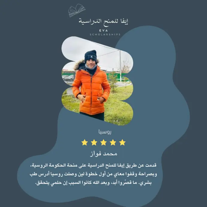 ألف مبروك للطالب محمد فواز لحصوله على منحة الحكومة الروسية لدراسة طب بشري في روسيا بعد تقديمه عبر شركة إيفا للمنح الدراسية التي كانت معه خطوة بخطوة حتى تحقّق حلمه.