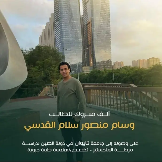 مبروك للطالب وسام منصور سلام القدسي لحصوله على منحة دراسية في جامعة تايوان بالصين لدراسة الماجستير بتخصص الهندسة الطبية الحيوية، في خطوة تعكس طموحه ودعم شركة إيفا للمنح الدراسية.