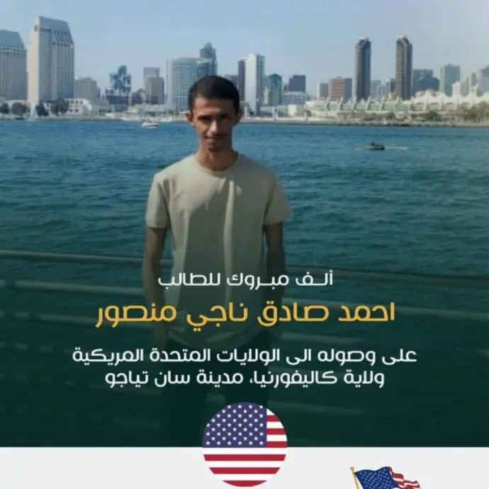 ألف مبروك للطالب أحمد لحصوله على منحة اللغة الإنجليزية في ولاية كاليفورنيا بمدينة سان دييغو بالولايات المتحدة الأمريكية، خطوة تعكس طموحه ودعم شركة إيفا للمنح الدراسية.