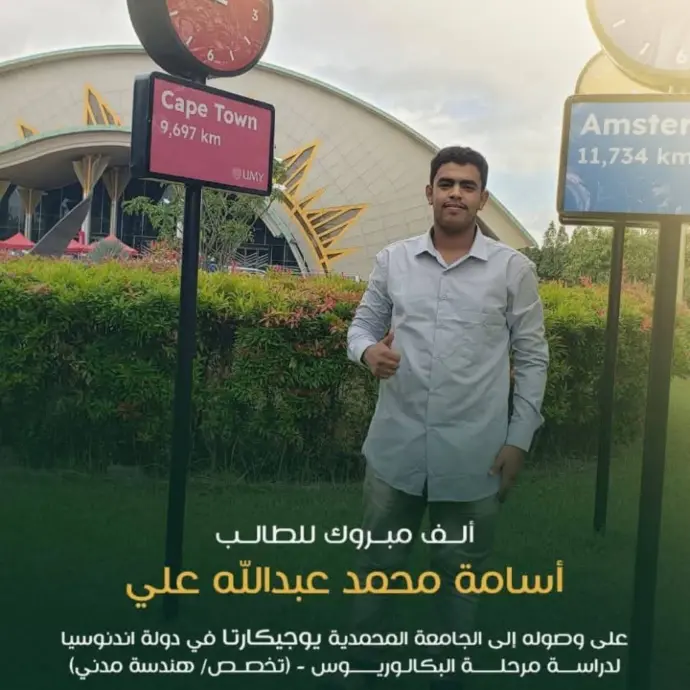 ألف مبروك للطالب أسامة لحصوله على منحة دراسية في الجامعة المحمدية يوجيكارتا بإندونيسيا لدراسة مرحلة البكالوريوس بتخصص الهندسة المدنية خطوة تعكس طموحه ودعم شركة إيفا للمنح الدراسية.