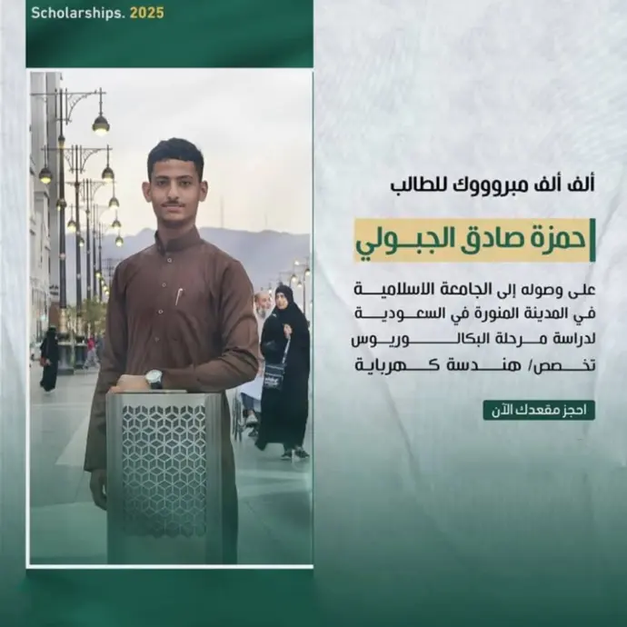 ألف ألف مبروك للطالب حمزة لحصوله على منحة دراسية في الجامعة الإسلامية في السعودية لدراسة مرحلة البكالوريوس بتخصص الهندسة الكهربائية، خطوة تعكس طموحه ودعم شركة إيفا للمنح الدراسية.