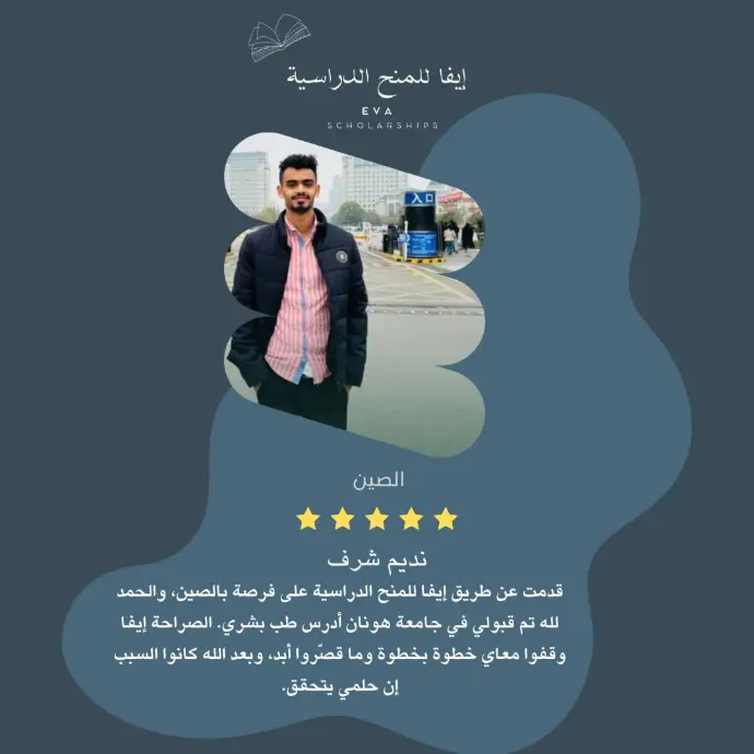 حصل على منحة جزئية لدراسة الطب البشري في جامعة هونان، ليبدأ رحلته الأكاديمية في الصين بدعم شركة إيفا للمنح الدراسية، وبخطوة تعكس طموحه نحو مستقبل مهني واعد.
